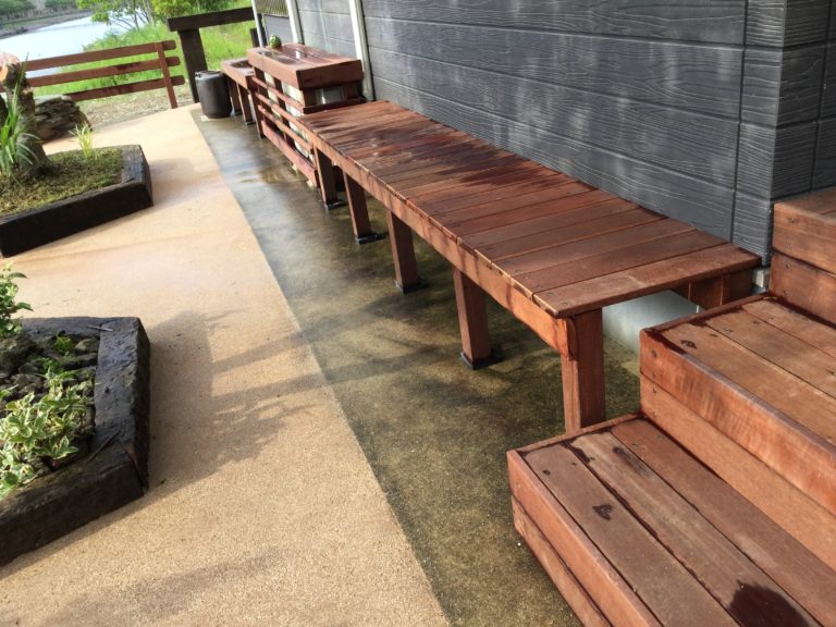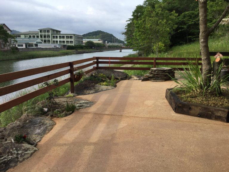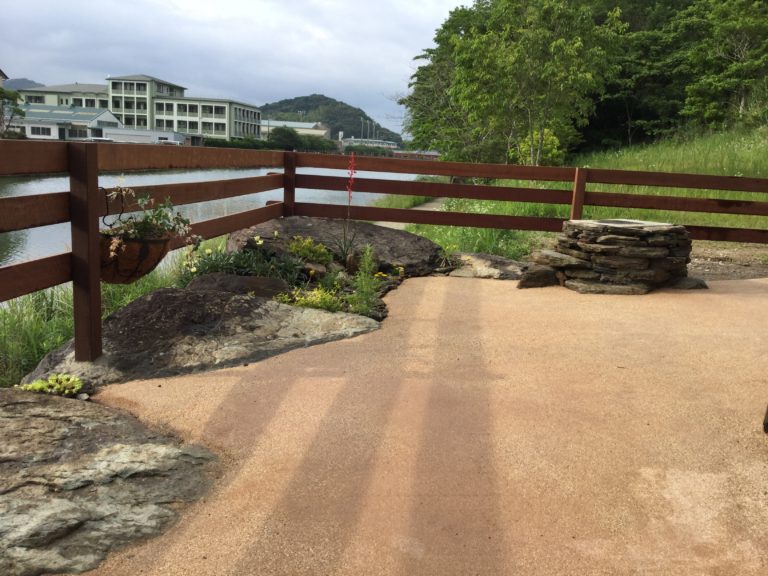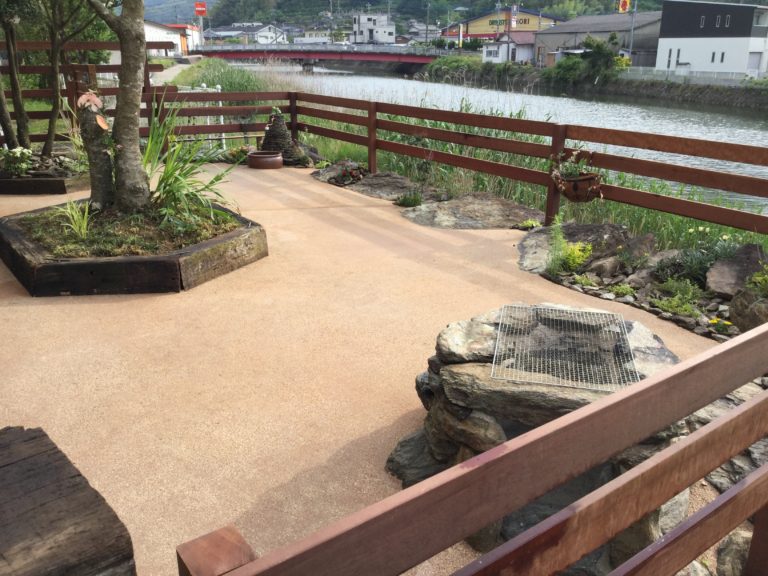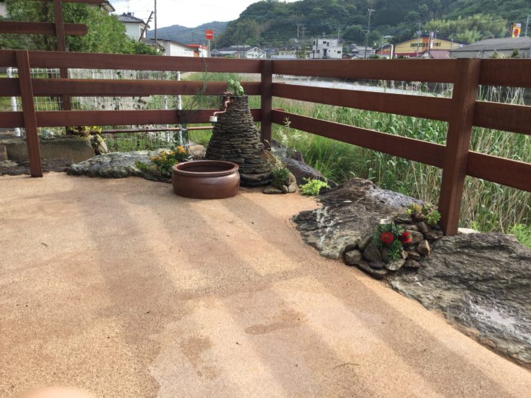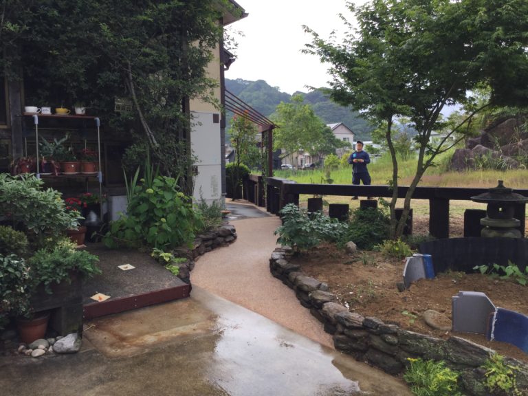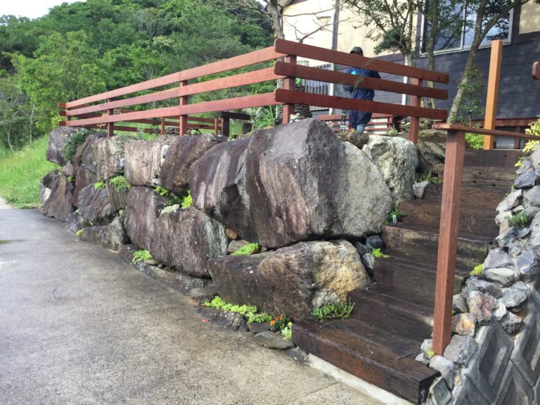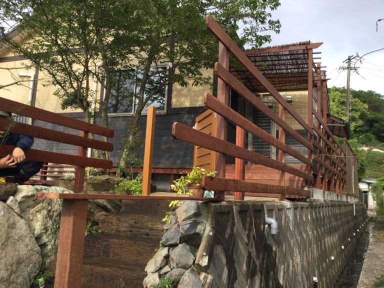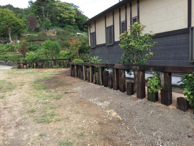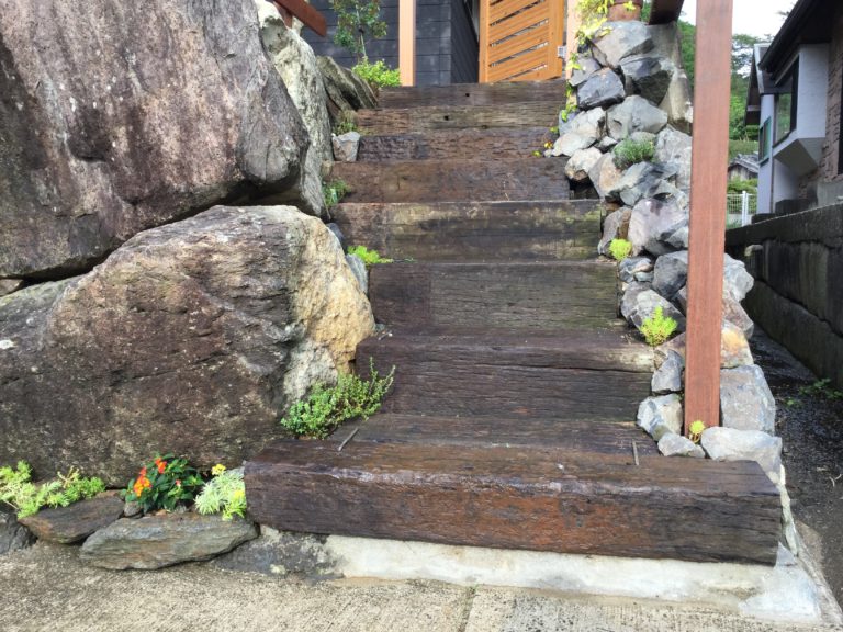 長崎市内でお庭のやり替えをさせていただきました。バーベキュー炉、枕木階段、石積み水栓、ウッドフェンス、ウッドデッキ、防草マサ土舗装など