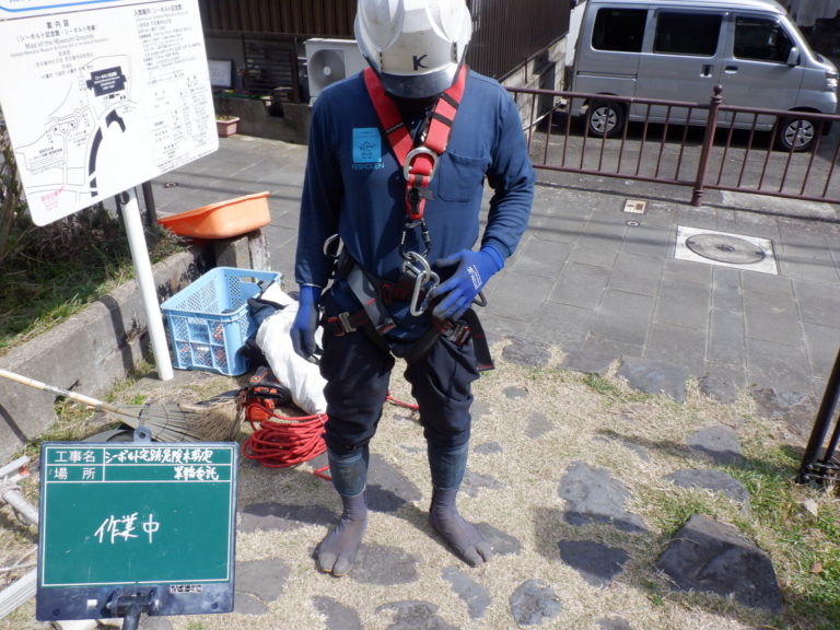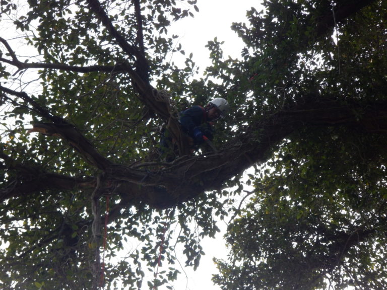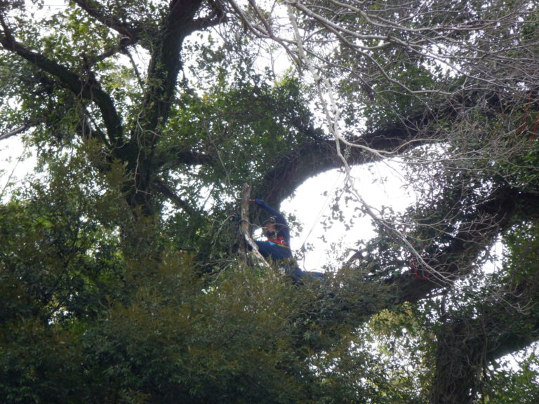 かなりの高木であるため、ザイルを使用して安全第一で作業を行いました。