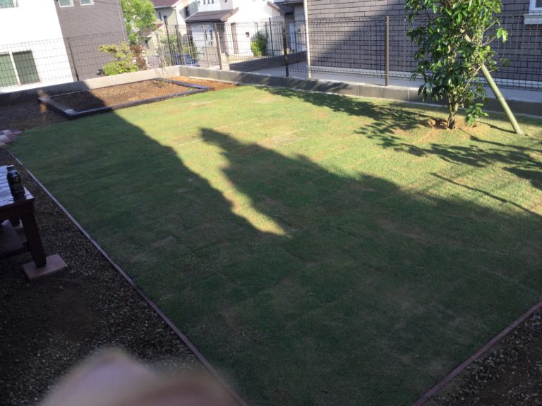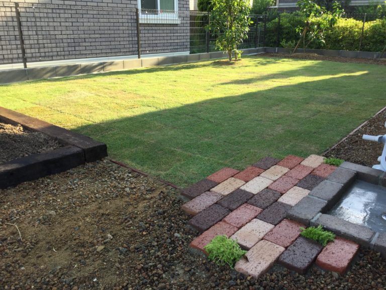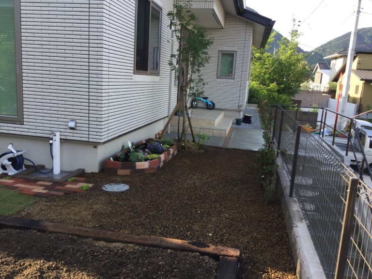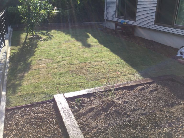 枕木で花壇を設置し、芝を貼りました。花壇内の土には大村土を使用し、たい肥や肥料などを混ぜ込んであります。おしゃれなお庭に仕上がりました。