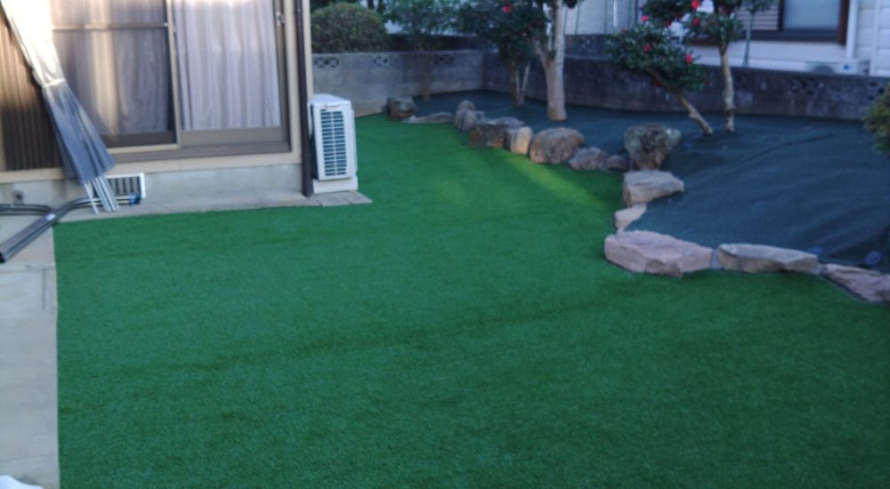 エリア 諫早市 施工期間 7日間 工事内容 今後の管理がしやすいよう、花壇や庭木の一部、芝などを撤去し、庭石を残して防草シート、人工芝を施工しました。また、家の両サイドは歩きやすいように草こなーずを施工しています。