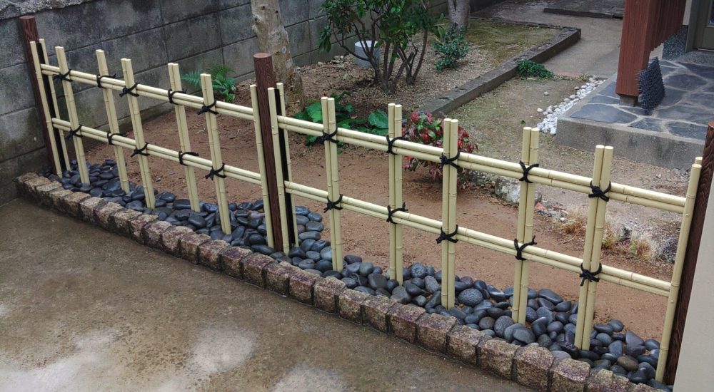 エリア 諫早市 施工期間 2日間 工事内容 ツゲの垣根が枯れたため、寂しくなった場所に腐敗しない塩ビ竹垣を施工しました。