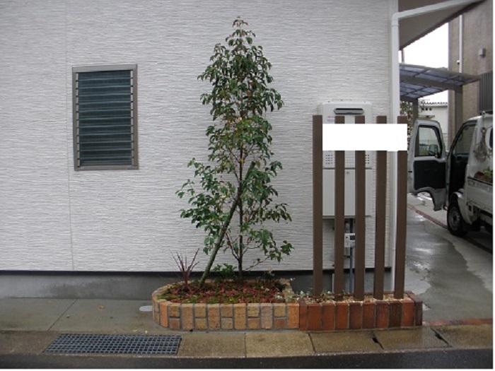 エリア 長崎市 施工期間 仕事内容 小スペースでも植栽することでオシャレに☆木のモニュメントには、将来的にツル性植物が巻付いていくよう設計しました。